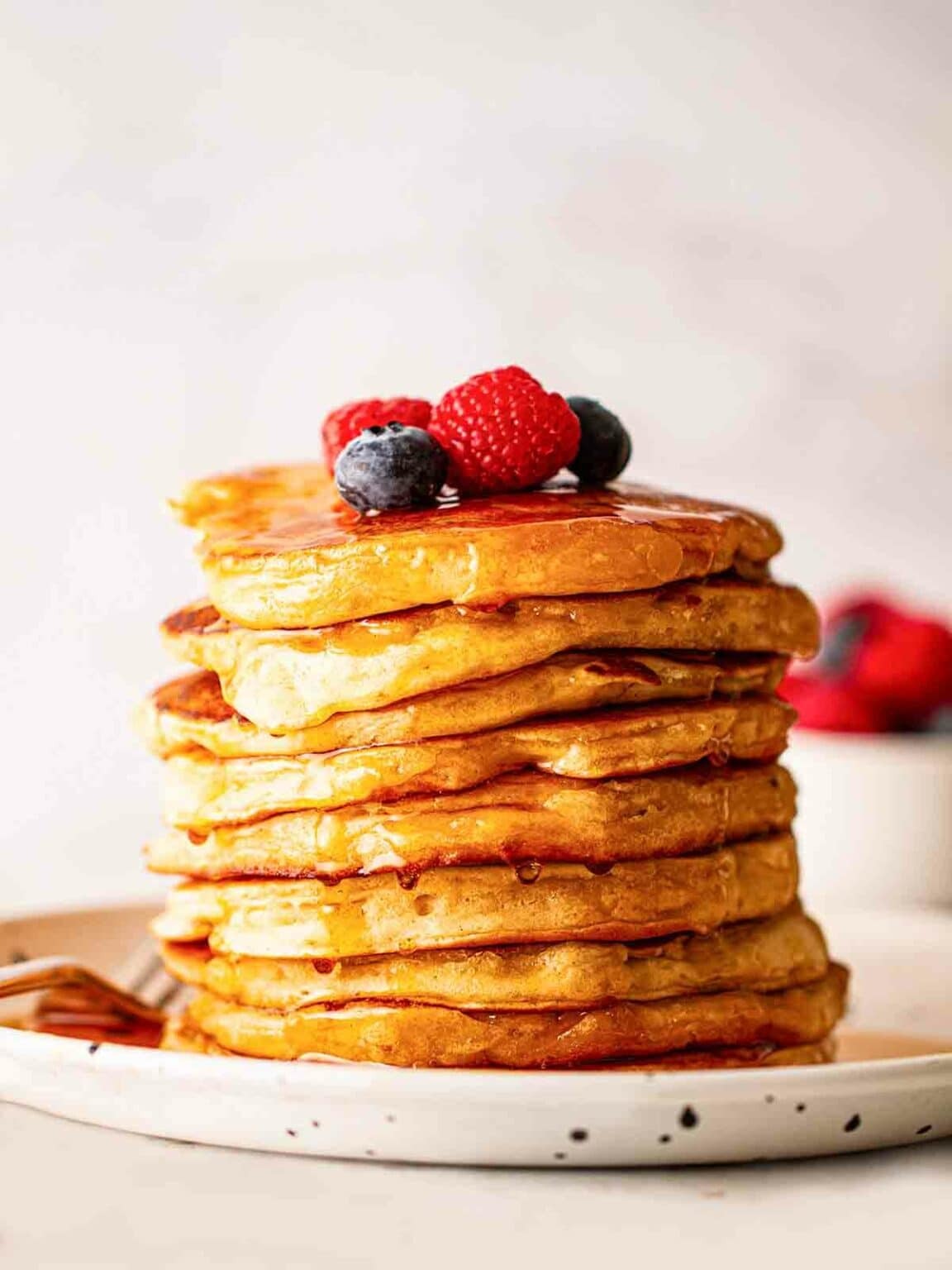 ⭐️ Cook as many pancakes as you can at a time and then keep them on a low heat in the oven as the remainders cook – this allows you to serve them at the same time